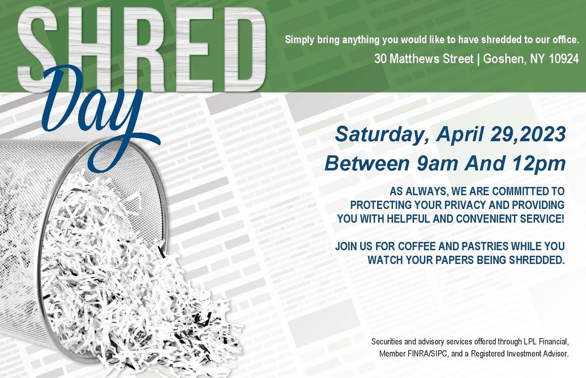 As always, we are committed to protecting your privacy and providing you with helpful and convenient service! Join us for coffee and pastries while you watch your papers being shredded.